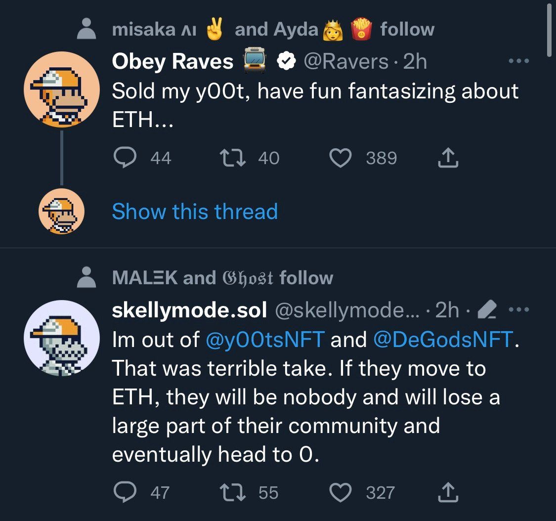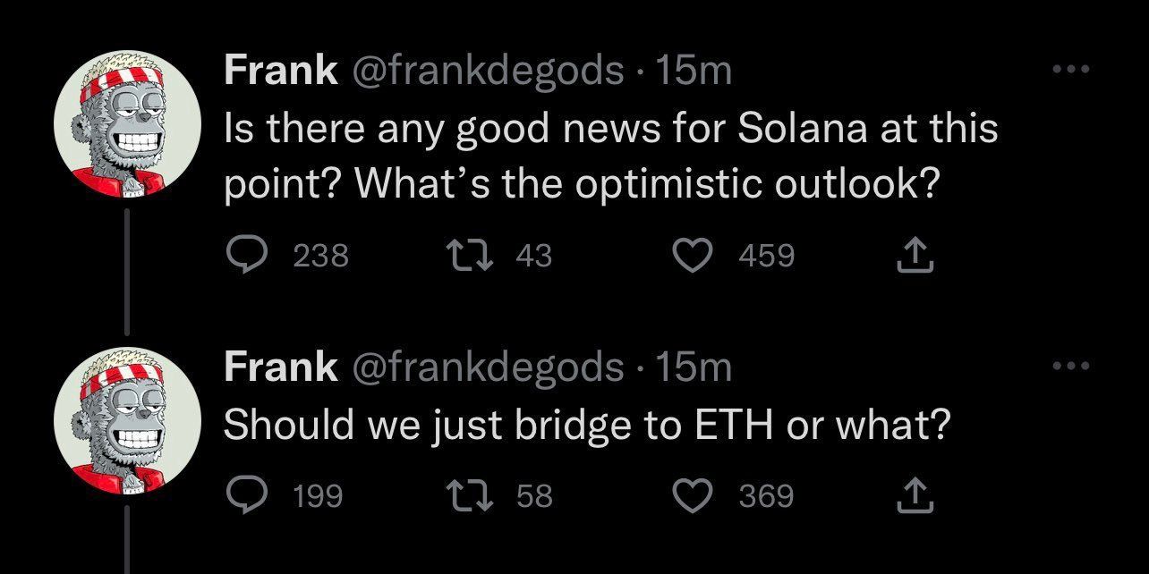 В момент, когда все и без того было плохо, создатель двух крупнейших NFT-проектов на Solana — DeGods & y00ts — участник криптосообщества под ником frankdegods подлил масла в огонь. В своем твиттере он предположил, что такое развитие событий приведет к необходимости переезда проектов на Ethereum.