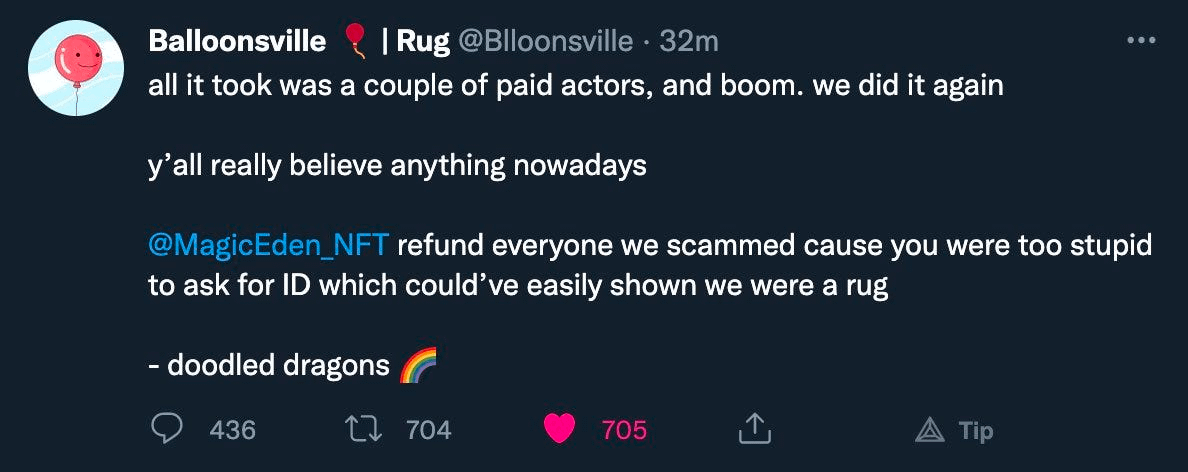 Balloonsville оказался одним из самых хайповых NFT-проектов на блокчейне Solana. Его создатели заработали около $500 тыс. на минтинге токенов. К сожалению для инвесторов оказалось, что за проектом стояли мошенники. Об этом злоумышленники сообщили сами, открыто насмехаясь над легковерными покупателями.