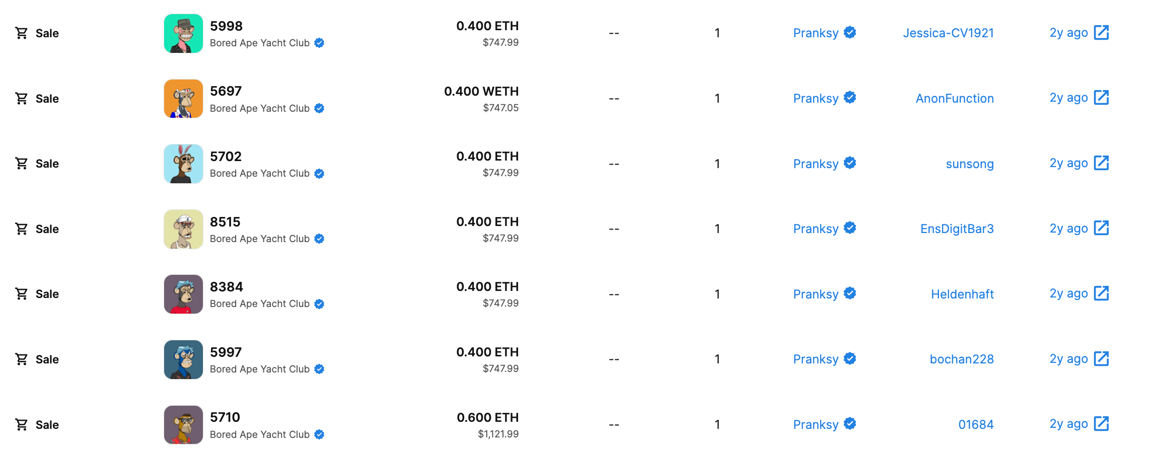 Участник криптосообщества под ником Pranksy некогда был обладателем 12,5% NFT-коллекции Bored Ape Yacht Club (клуб скучающих обезьян). Он продал все свои токены в течение трех месяцев с момента минтинга — незадолго до того, как цены на NFT из коллекции Bored Ape Yacht Club взлетели до небес.