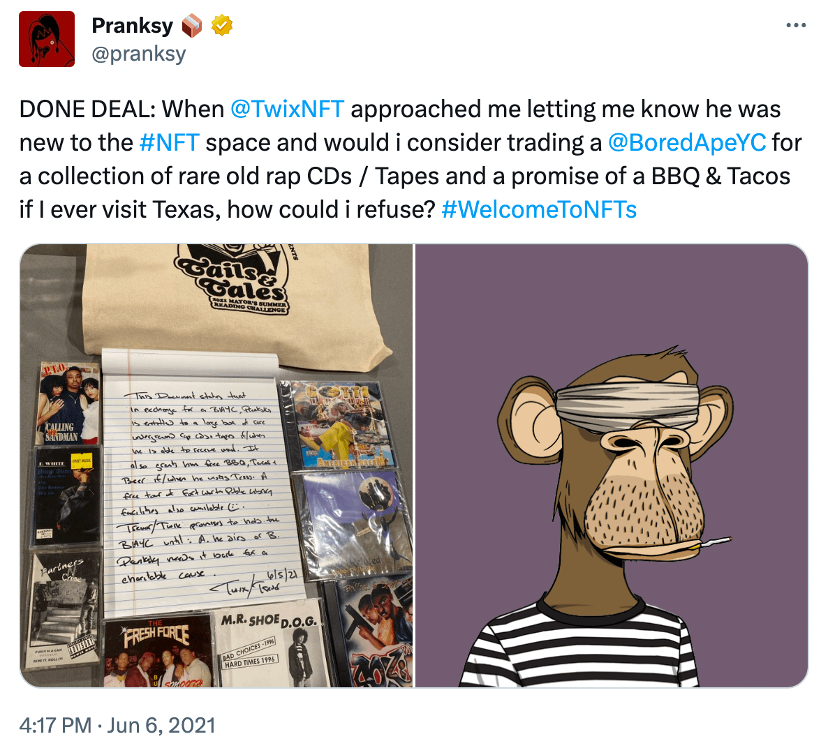 Один из токенов Pranksy обменял на коллекцию музыкальных записей. Даже с учетом падения цен на рынке цифровых активов в 2022 году, сделка выглядит крайне невыгодной.