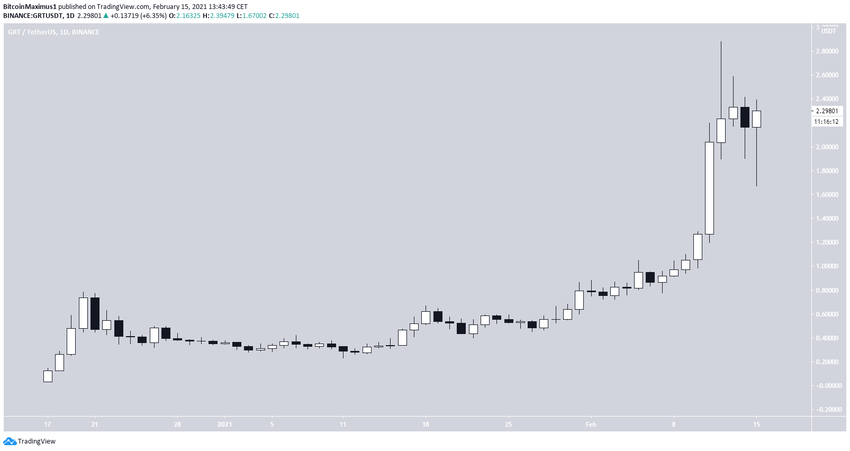 На графике по GRT можно увидеть, что последнюю неделю цена активно укреплялась и в итоге достигла 12 февраля нового рекордного максимума на $2.81. После этого альткоин отскочил ниже, но затем все же смог отыграть почти все потерянные очки.