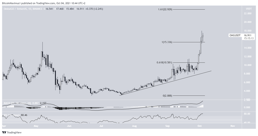 Токен OMG с 20 июля рос вдоль линии всходящей поддержки. За период с 6 по 20 сентября он безуспешно пытался прорваться выше уровня Фибо 0.618 коррекции на $10.60.