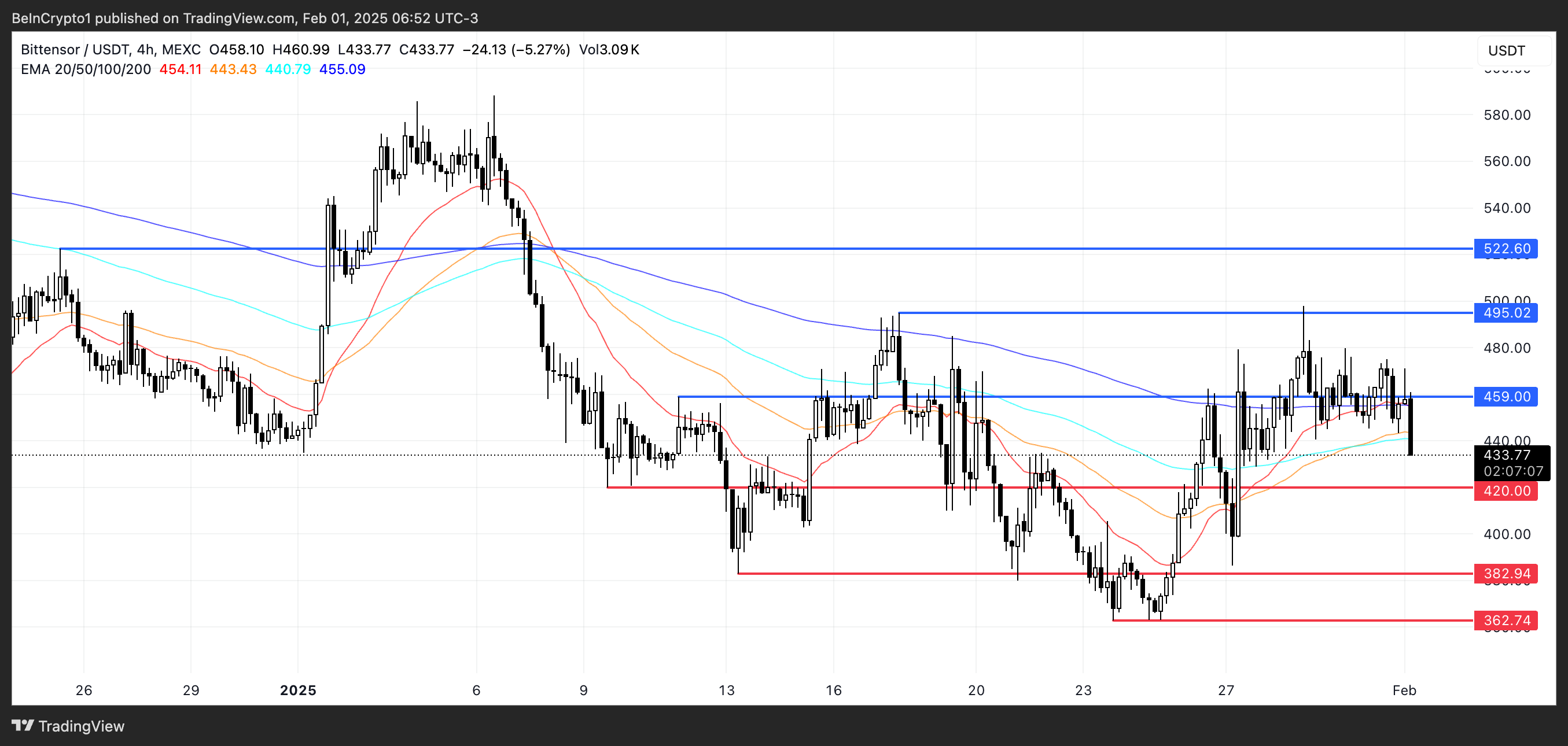 Если восходящая динамика ускорится, TAO может протестировать уровни сопротивления на $459 и $495. Следующая масштабная цель — $522.
