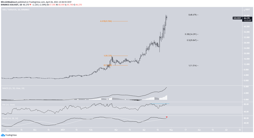 SOL достиг минимума 18 апреля на уровне $21.10. С тех пор монета быстро дорожает. Кульминацией бычьего забега стал исторический максимум, достигнутый 25 апреля на уровне $48,64. В совокупности, относительно предыдущего минимума монета подорожала на 132%.