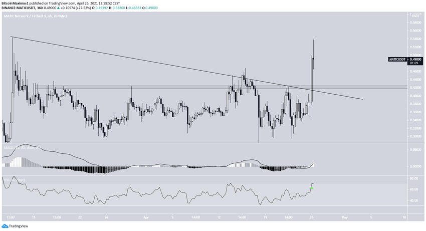 After that, it began to follow a descending resistance line. MATIC успешно пробился выше этой линии 26 апреля и достиг максимума в районе $0,538. Таким образом цена сформировала двойную вершину, несмотря на бычьи сигналы технических индикаторов.