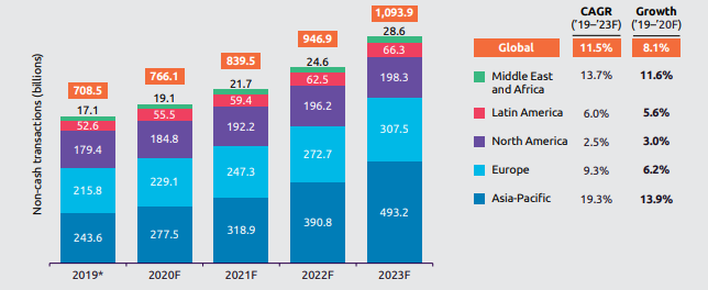 В тоже время рынок цифровых платежей показал стремительный рост. Об этом ранее заявляла глава ЕЦБ Кристина Лагард. По ее словам, половина населения стран ЕС предпочитают платить в цифровом виде, и во время пандемии этот показатель еще больше увеличился. Согласно данным World Payments Report 2020, рост цифровых платежей продолжится и к 2023 году составит порядка $1 трлн.