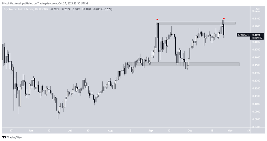 CRO сформировал двойную вершину на уровне $20. Это медвежий паттерн, который, как правило, заканчивается разворотом тренда.