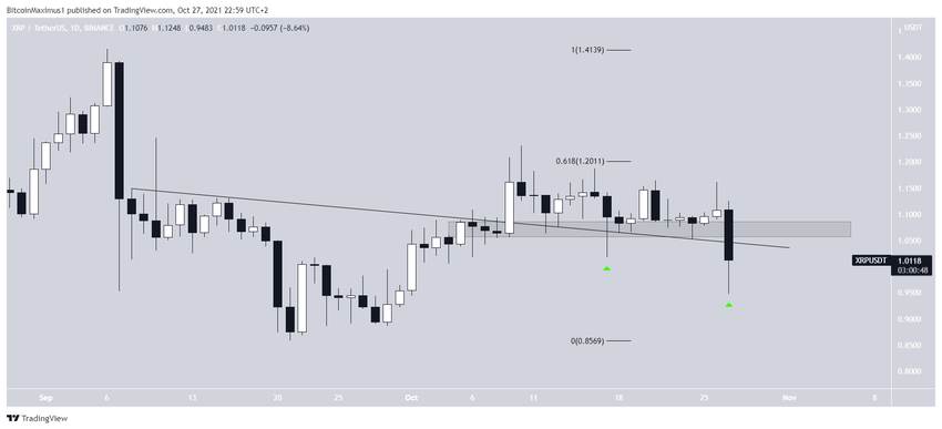XRP пробил нисходящую линию сопротивления 9 октября, но не смог развить восходящую динамику. На следующий день токен отскочил от сопротивления $1,20 и устремился вниз.