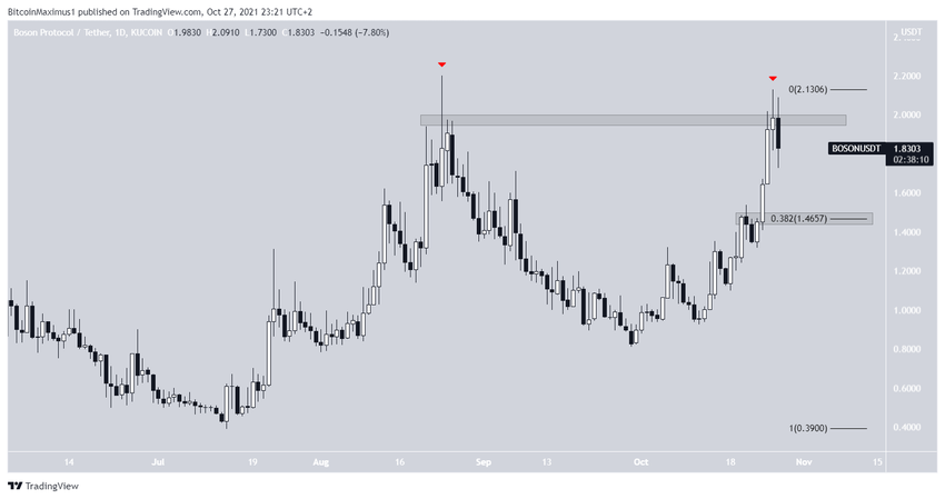 Как и в случае с CRO, BOSON сформировал двойную вершину, которая считается медвежьим паттерном. Кроме того, обе вершины сопровождается длинными верхними свечами, что считается признаком давления со стороны продавцов.