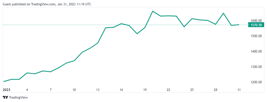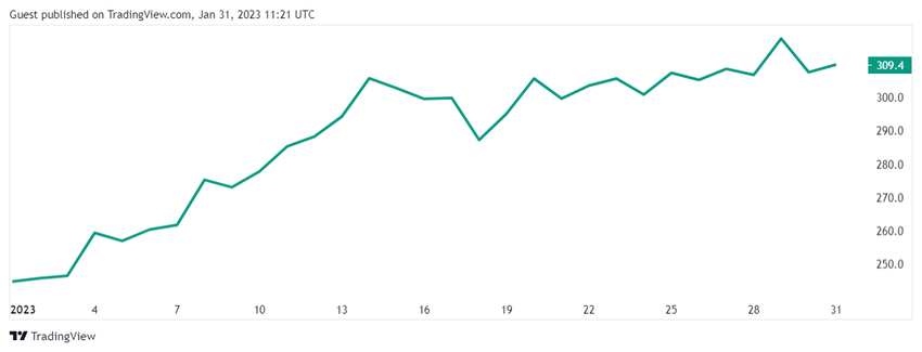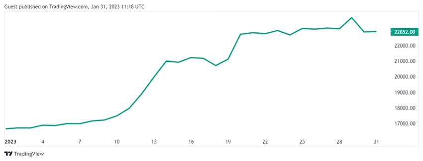 Биткоин в январе 2023 показал наилучший месячный прирост с октября 2021 года. Всего за один месяц криптовалюта в моменте выросла более чем на 40% почти до $24 000, по данным TradingView. Рыночная капитализация биткоина подскочила до $440,6 млрд.