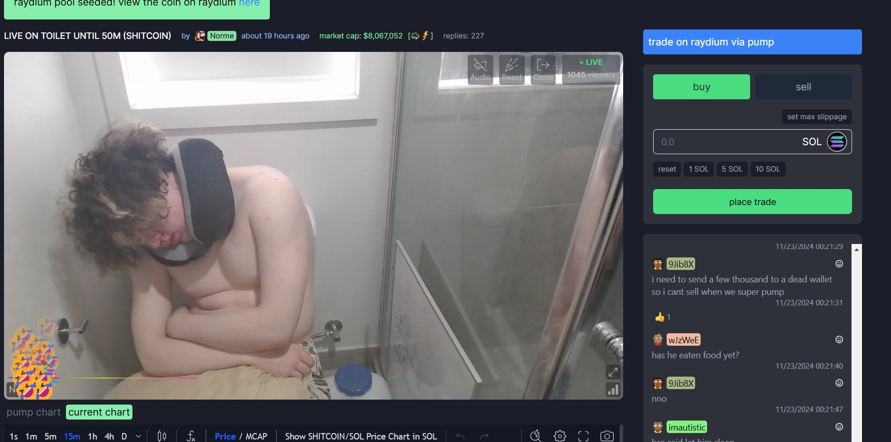 Разработчик $SHITCOIN пообещал не выходить из туалета, пока его токен не вырастет до $50 миллионов. Все это время он стримил и люди реально покупали токен. Капитализация почти достигла цели. Кринж — в полном отказе от здравого смысла и достоинства. Мем стал важнее человека.