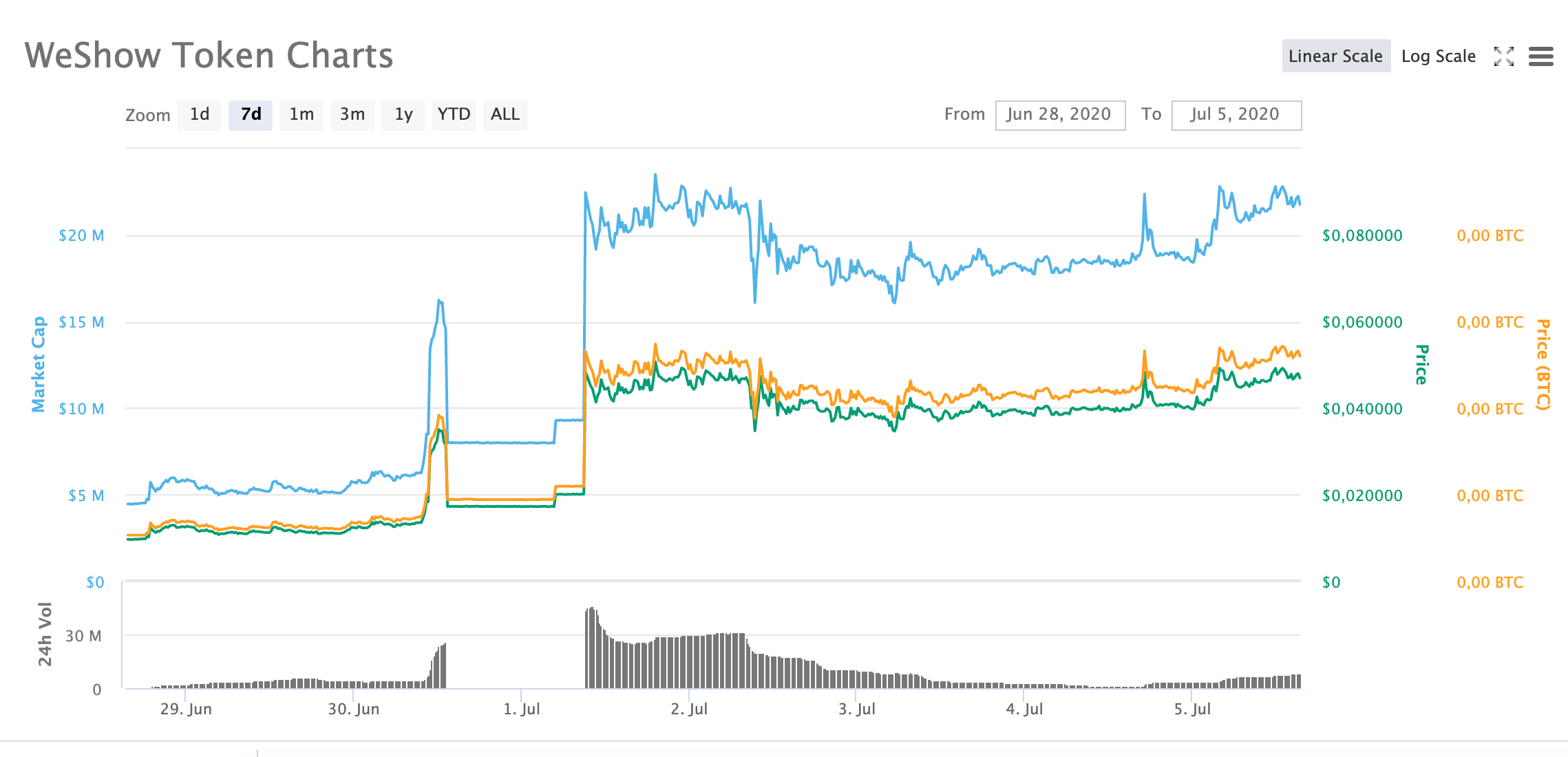 WeShow Token (WET) находится на 273 месте в рейтинге CoinMarketCap и на момент написания статьи стоит $0,047272. Рыночная капитализация токена превышает 21 млн долларов, а среднесуточный объем торгов — более 8 млн долларов. WET достиг текущих максимумов на уровне $0,050690 и после просадки к $0,03486, стабилизировался на текущих уровнях. Курс токена вырос на 18% за минувшие сутки и поднялся поднялся почти 400% в недельном соотношении. Токен зарегистрирован только на бирже Bithumb и торгуется в паре с корейской воной.