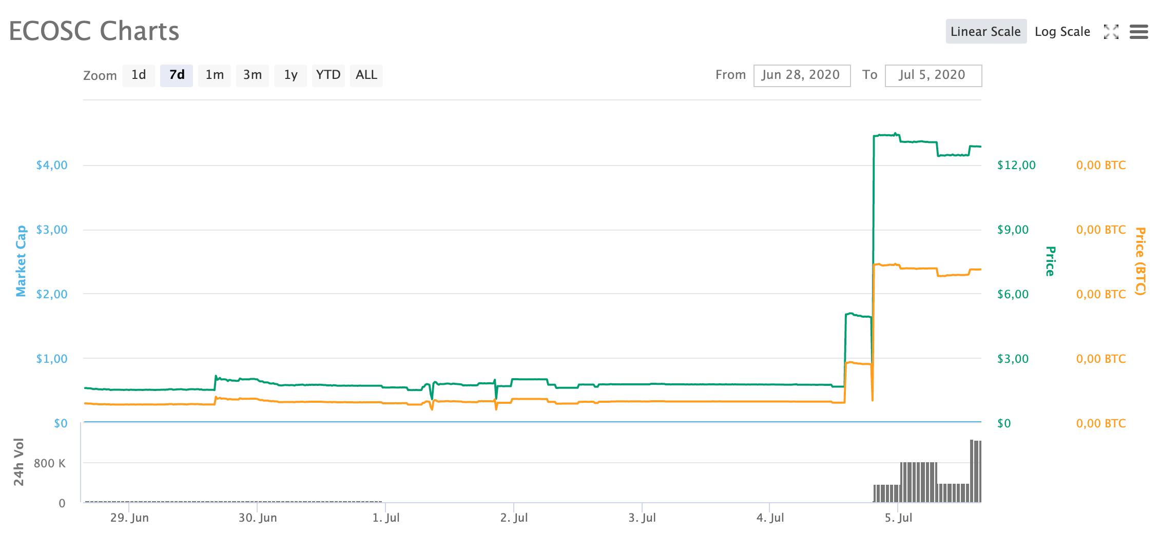 ECOSC (ECU) занимает далекое 2127 место в рейтинге CoinMarketCap. Его текущая рыночная капитализация остается под вопросом, а среднесуточный объем торговли $1.2 млн. Малоизвестная монета стремительно взмыла вверх буквально за считанные часы. Еще в субботу 4 июля она продавалась по $1.66, но сегодня она стоит уже $12.85. За сутки ECU подорожал почти на 170%, а в недельном соотношении рост превысил 700%. Токен зарегистрирован на криптовалютной бирже Coinsbit, через которую идет почти 100% объема торговли через пары с USDT и BTC.