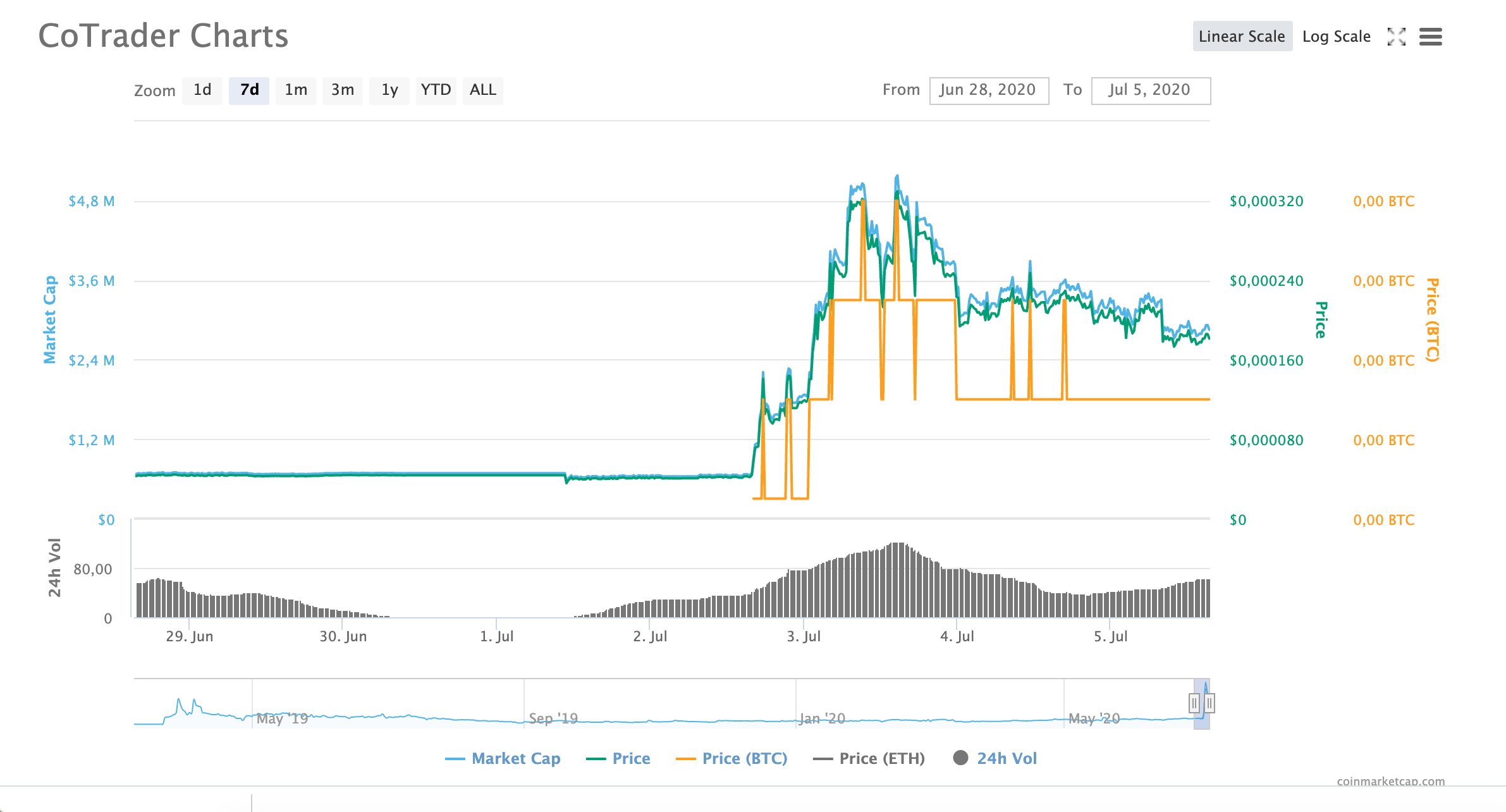 CoTrader (COT) сейчас торгуется на отметке $0,000179 и находится на 684 позиции в рейтинге альткоинов. На момент написания статьи капитализация монеты составляет $2,8 млн, а среднесуточный объем торговли — 63 тыс. долларов. За неделю монета выросла в цене более чем на 300%, при этом за минувшие сутки ее стоимость снизилась на 17%, что указывает на угасание восходящей динамики. Токен зарегистрирован на бирже Bancor Network, а также на Hotbit, однако, по версии и CoinMarketCap, индекс доверия к данным этой платформы крайне низок.