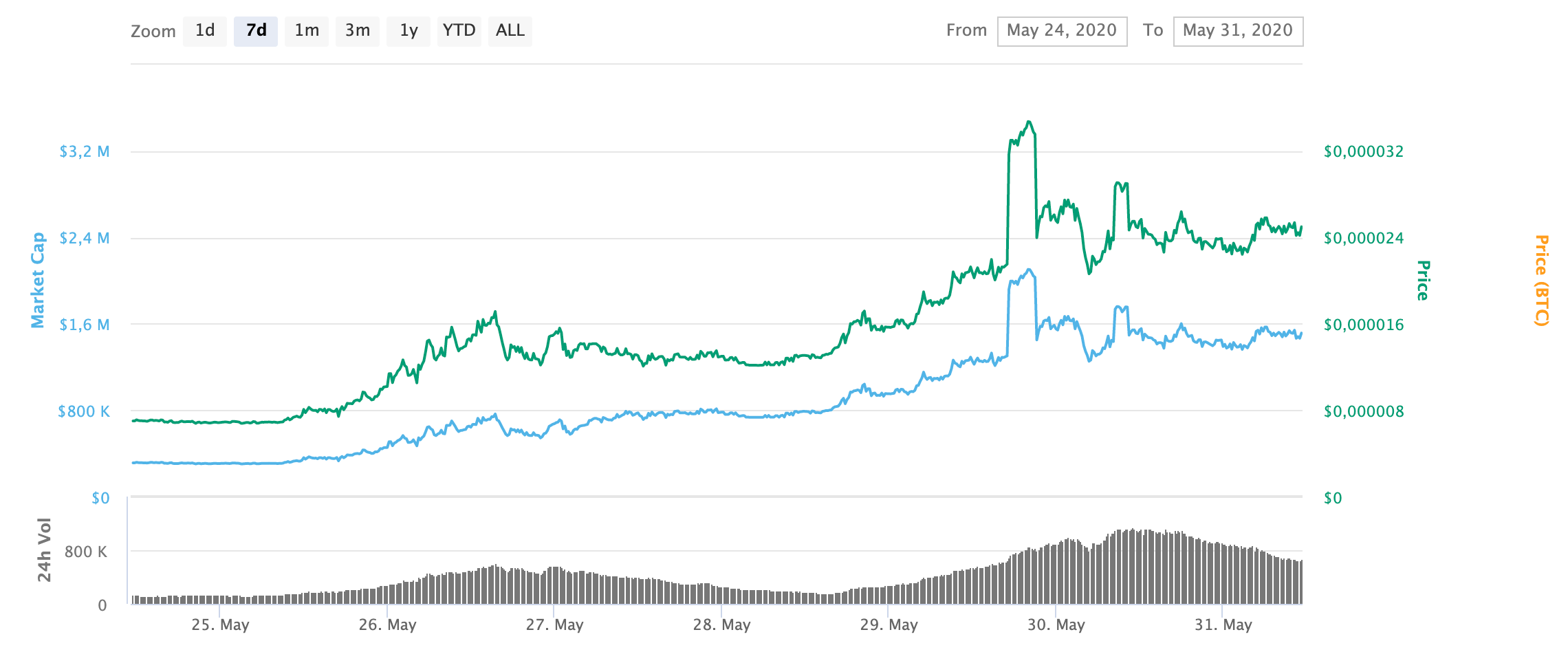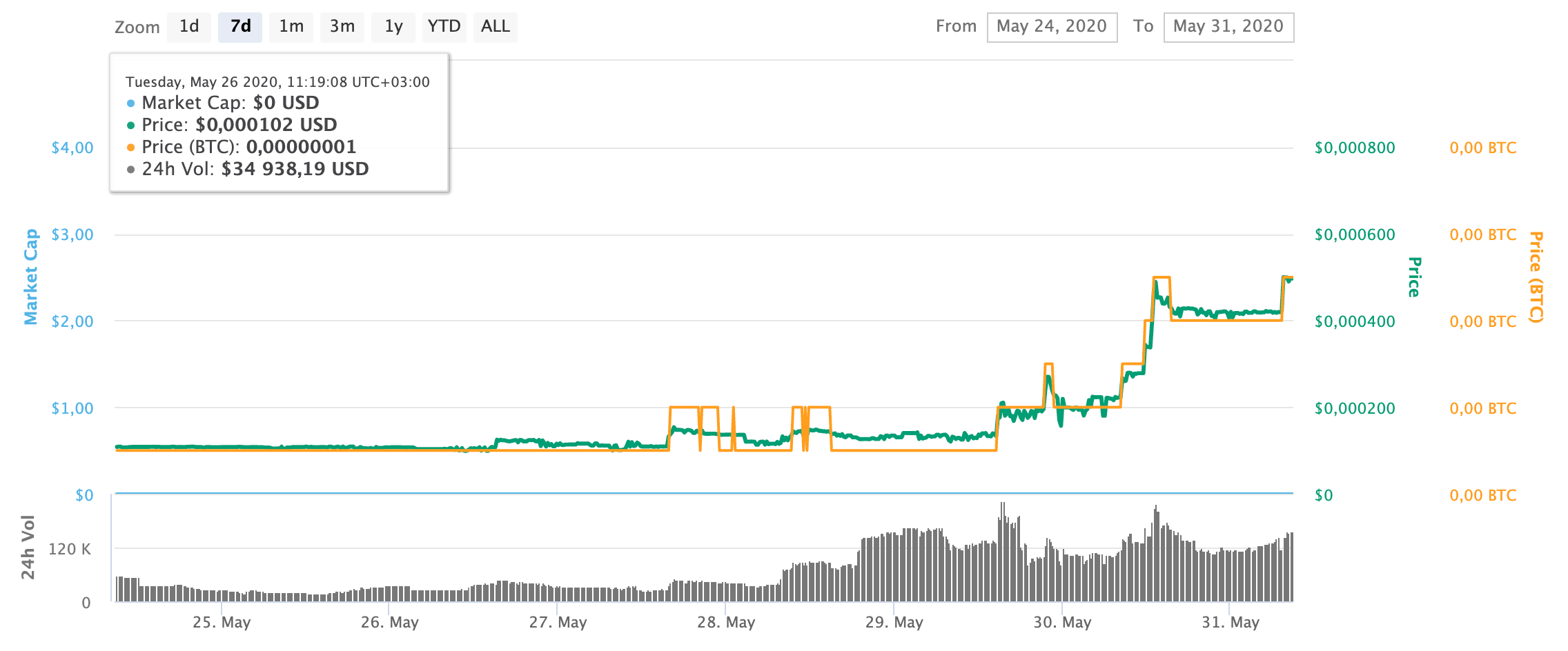 Fox Trading (FOXT) находится на далеком 1445 месте в рейтинге CoinMarketCap с текущей рыночной капитализацией $142 тыс. и среднесуточным объемом торговли $77 тыс. За последние семь токен подорожал более чем на 300% и в моменте тестировала отметку $0,031985. Текущий курс VOL — $0,015639. FOXT возобновил рост после резкой восходящей коррекции и отыграл часть внутридневных потерь. Движение происходит на высоких объемах.