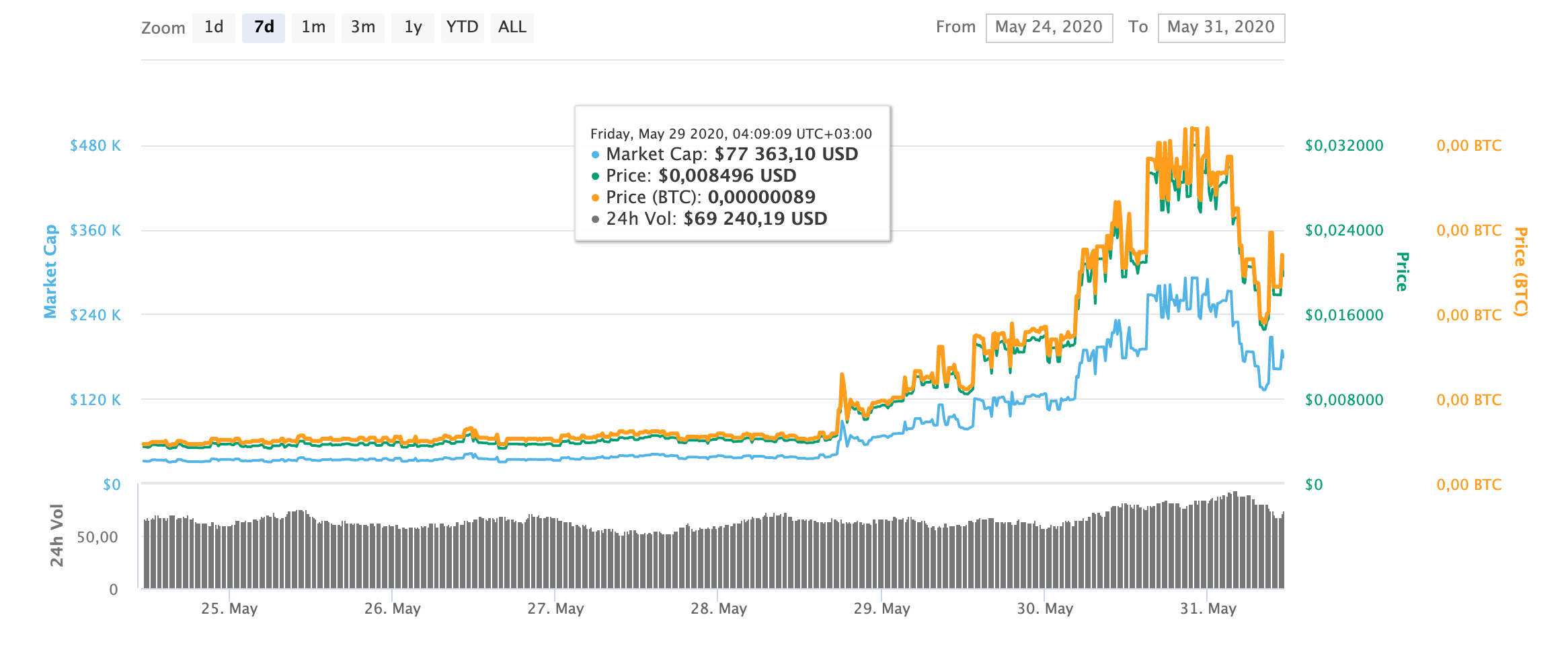 KickToken (KICK) за семь дней подорожала на 245% и в моменте тестировал исторический максимум на уровне $0,000034. Текущий курс KICK $0,000025, а среднесуточный объем торгов достиг отметки $663 тыс. Монета занимает 827 строчку в рейтинге CoinMarketCap с капитализацией $1,48 миллиона. Более половины всего объема торгов токеном идут через биржу Kucoin в парах с BTC и ETH.