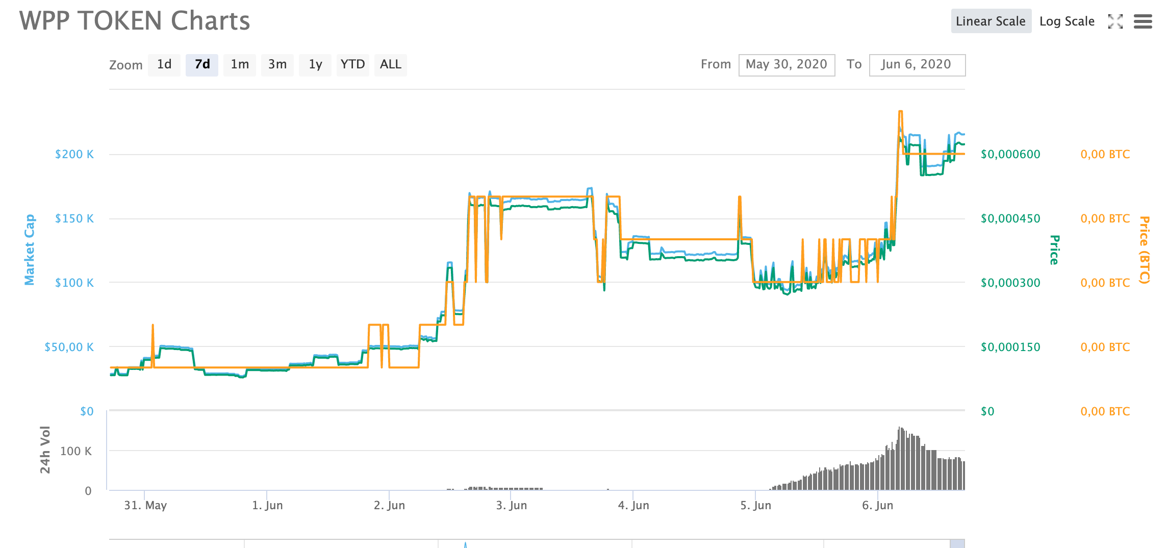 WPP TOKEN (WPP) занимает 1341 место в рейтинге CoinMarketCap, при этом его текущая рыночная капитализация составляет $215 тыс, а среднесуточный объем торговли — $75 тыс. Токен зарегистрирован только на одной бирже,DigiFinex, и торгуется в паре с USDT. За последние семь токен подорожал почти на 700% и в моменте тестировала отметку $0,000633. Текущий курс WPP — $0,000622. WPP закрепился в диапазоне вблизи текущих максимумов на фоне снизившихся объемов торговли.