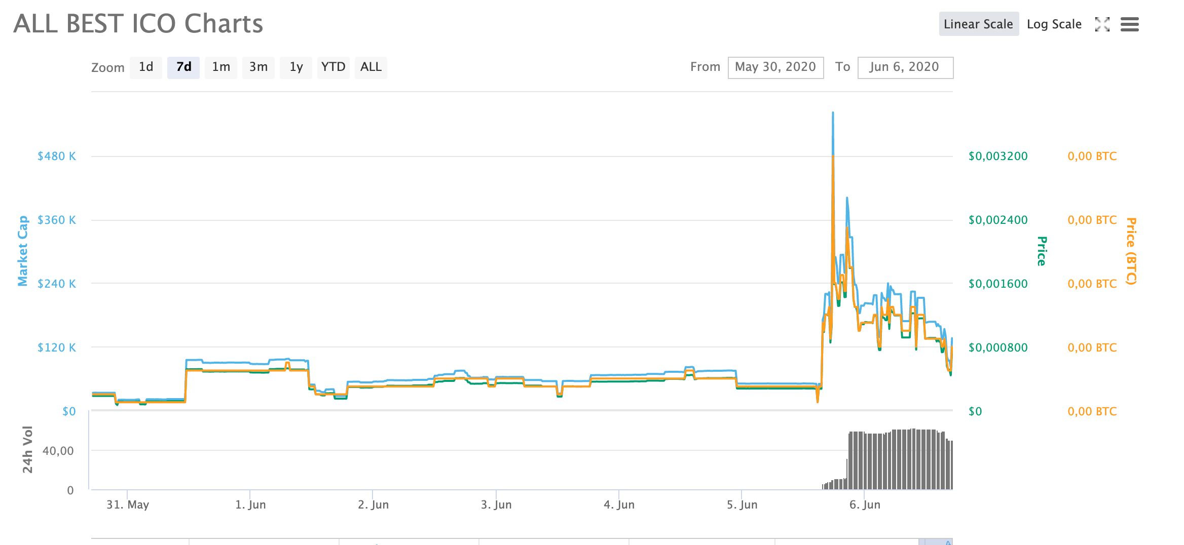 ALL BEST ICO (ALLBI) за семь дней подорожала на 329% и в моменте тестировала отметку $0,003082. Текущий курс ALLBI — $0,000741, а среднесуточный объем торгов достиг отметки $50 тыс. Монета занимает 1456 строчку в рейтинге CoinMarketCap с капитализацией $135 тыс. Более 90% всего объема торгов токеном идут через биржу Crex24 в парах с BTC и ETH.