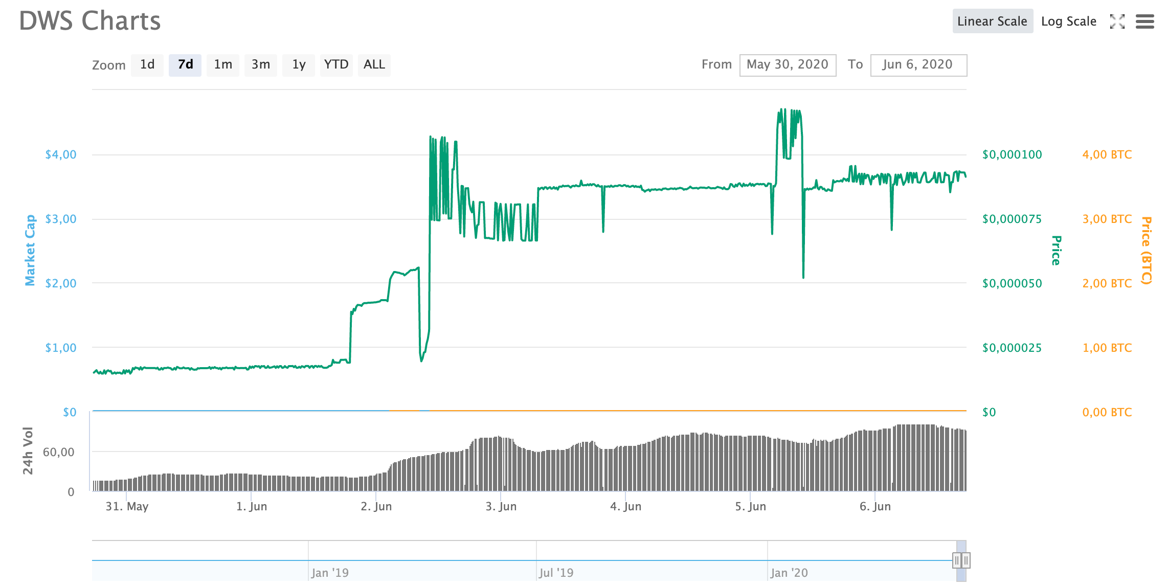 DWS можно купить по цене $0,000089, при этом исторический максимум был зафиксирован 12 июля 2018 года на отметке $1,93.