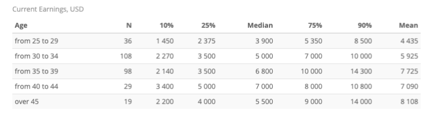 «Наибольшее количество данных получено по сферам Digital (медиана – 5750$), электронная коммерция (5500$), финтех и банкинг (6000$). В них, как и на протяжении прошлых двух лет, сохраняется один из самых высоких уровней вознаграждения. Но в этом году, к лидерам добавились искусственный интеллект и машинное обучение (6225$), медтех (5500$) и консалтинг (в основном, речь о проектной работе, инвестиционных фондах и консалтинговых компаниях, на медиане – 7335$)», — говорится в отчете.