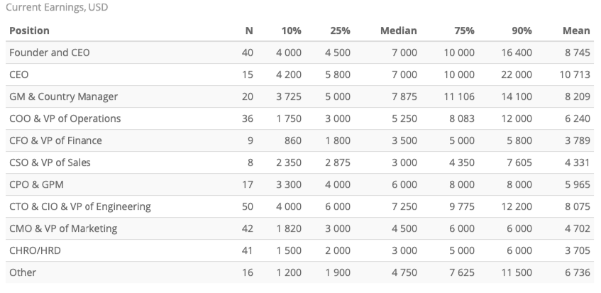 Самые высокие заработные платы установлены для СЕО и Country Manager. Меньше всего получают HRD.