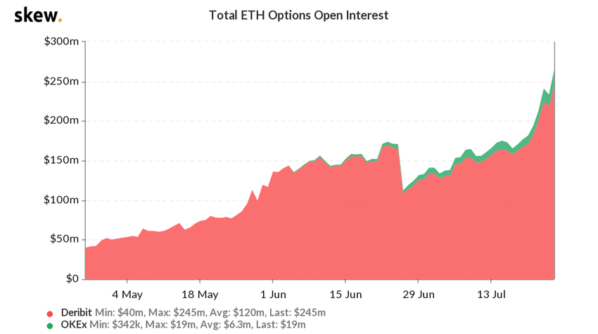 Объем торговли фьючерсами и опционами на Ethereum растет в этом месяце, что особенно четко прослеживалось на прошлой неделе. Рост оборотов и открытого интереса указывает на повышение доверия на рынке, особенно в свете тестирования биткоином уровня $10000 впервые с начала июня.