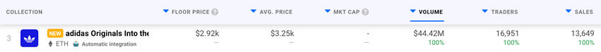 Как видно выше, коллекция токенов от Adidas привлекла около 17000 трейдеров и вошла в тройку лучших коллекций NFT DappRadar за неделю, сгенерировав более $44 млн в объемах. Всего в Adidas распродали 30 000 NFT, а средняя цена за токен составила ~$3200.