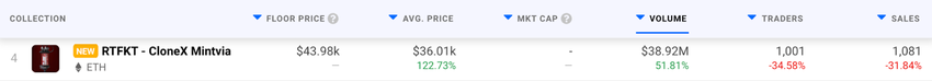 Другая коллекция от Nike — CloneX Mintvials — тоже за последние семь дней сформировала объем торгов почти на $39 млн. Средняя цена токена из коллекции подскочила на 122% до ~$36 000.