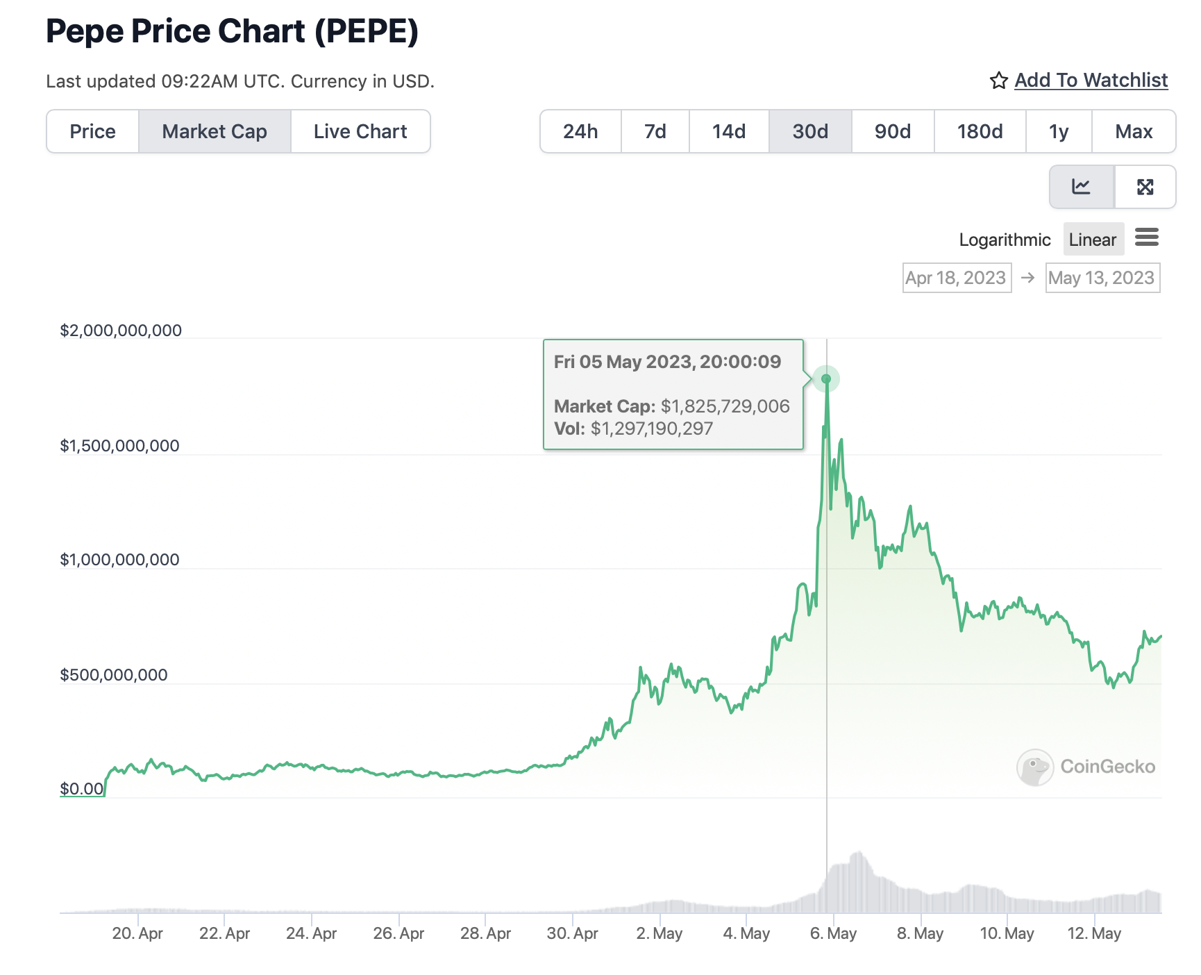 Ажиотаж вокруг мемкоина PEPE, похоже, угасает: токен торгуется на 60% ниже исторического максимума. Рыночная капитализация актива просела более чем в два раза с момента достижения отметки в $1,85 млрд 5 мая.