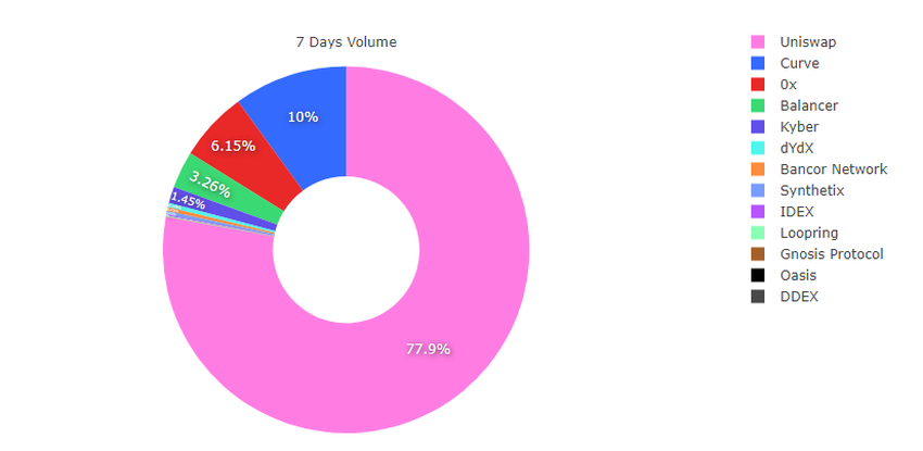 SponsoredЭто не единственная статистика, подтверждающая текущее лидерство Uniswap. Так, согласно данным Dune Analytics, доля Uniswap на рынке DEX составляет в настоящее время 77,9%. Ее ближайшим соперником является Curve с 10,03%. Еженедельные торговые объемы Uniswap и Curve равняются $2,67 млрд и $344 млн, соответственно.