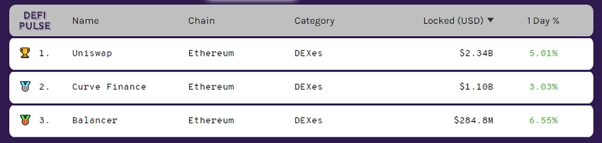 Что касается самого сегмента DEX, здесь бесспорным лидеров является Uniswap. Биржа значительно опережает своих ближайших конкурентов по торговым объемам. По данным аналитического портала DeFi Pulse, общая стоимость активов, заблокированных на Uniswap, составляет $2,34 млрд. На втором и третьем месте расположились Curve Finance и Balancer, с $1,1 млрд и $284 млн, соответственно.