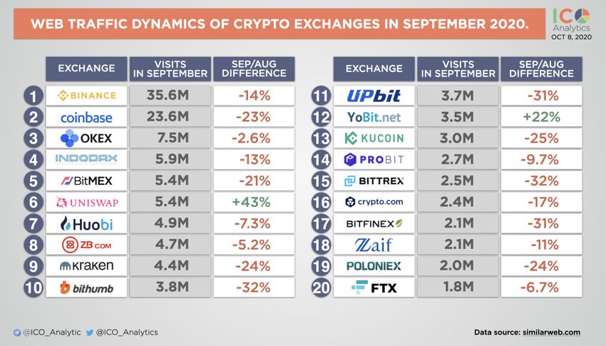 Трафик криптобирж, сентябрь 2020. Источник: ICO Analytics