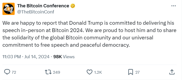 Криптоконференция Bitcoin 2024 пройдет с 25 по 27 июля в Нэшвилле, штат Теннесси. О том, что Трамп примет участие в мероприятии стало известно 11 июля 2024 года, однако в график политика вмешалось покушение. Спустя сутки после инцидента команда Bitcoin 2024 подтвердила участие кандидата в президенты, несмотря ни на что.
