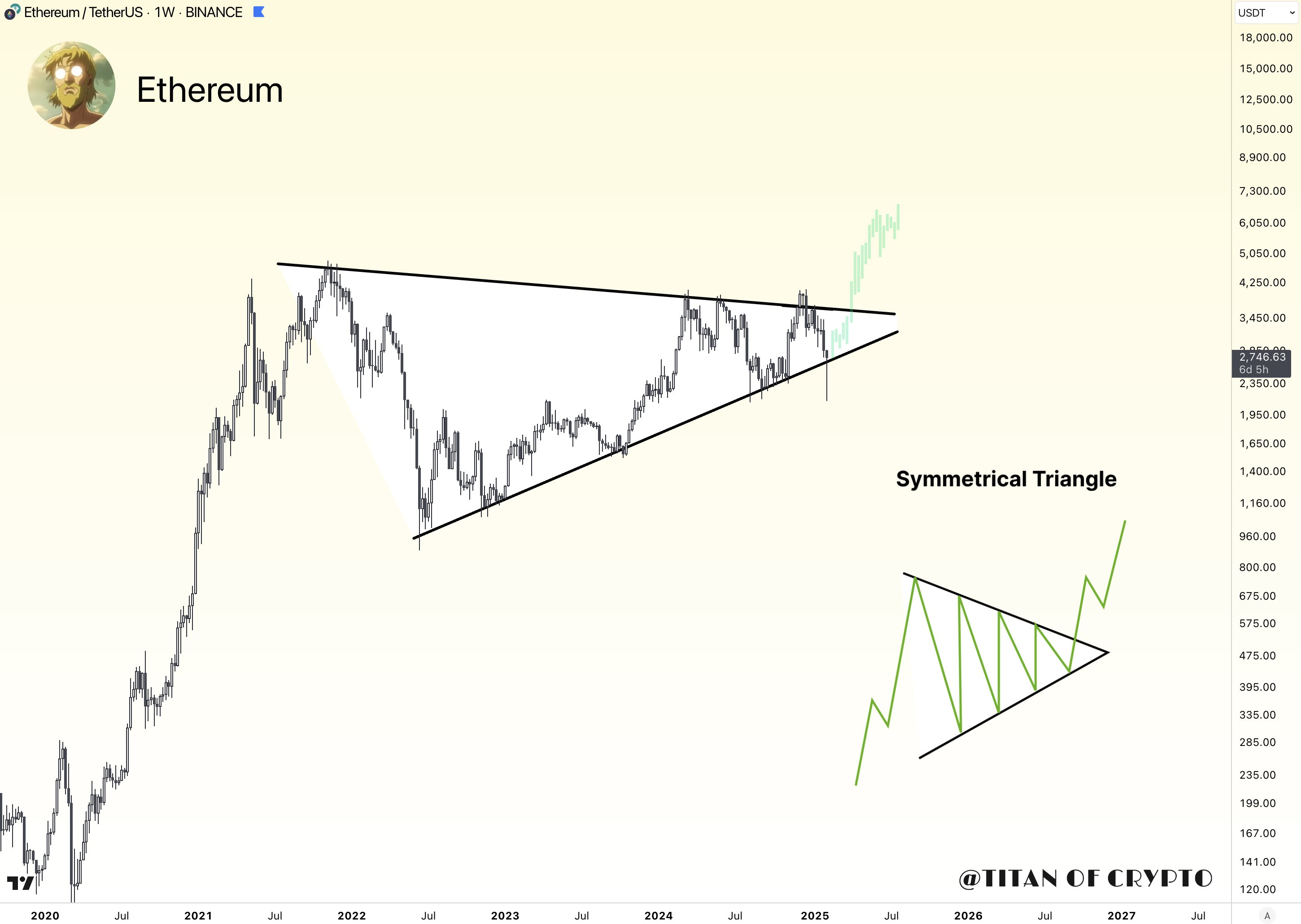 Популярный в криптосообществе инвестор Titan of Crypto в свою очередь поделился прогнозом. Он считает, что курс Эфира вскоре отправится обновлять максимум. По его наблюдениям, криптовалюта движется в теле симметричного треугольника. Прорыв верхней грани фигуры, с точки зрения теханализа, может открыть монете путь к новым вершинам.