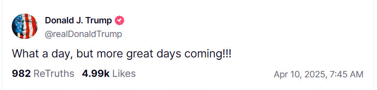 Рост рынков отражает позитивное восприятие действий Трампа инвесторами, которые искали какие-либо признаки смягчения жесткой тарифной политики. Приостановка тарифов на большинство стран, кроме Китая, придала рынкам уверенность.