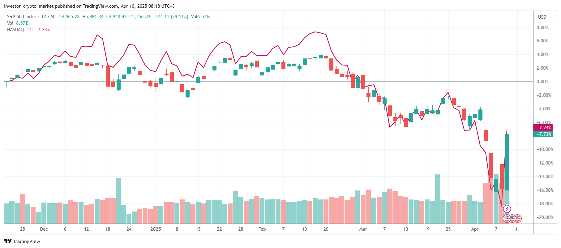 Сразу после объявления решения Трампа по тарифам акции начали резко расти. Индекс Dow Jones прибавил почти 3000 пунктов (7,87%), S&P 500 подскочил на 9,5%, а Nasdaq увеличился на 12,2%.В результате 9 апреля стало лучшим днем для индекса S&P 500 с октября 2008 года, а для Nasdaq — с января 2001 года. Активнее других на позитивные новости отреагировали акции таких компаний, как Amazon, Nike и Tesla.