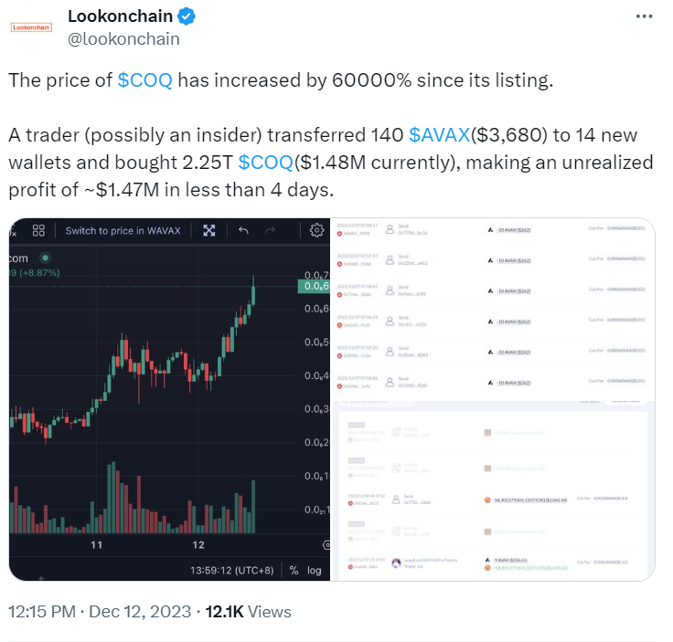 Авторы Lookonchain обратили внимание на действия неизвестного трейдера, которому удалось заработать на активном росте криптовалюты Coq Inu (COQ). С момента запуска торгов токеном он подорожал примерно на 60 000%. По мнению Lookonchain, в распоряжении трейдера могла оказаться инсайдерская информация, руководствуясь которой он вовремя закупился монетой.