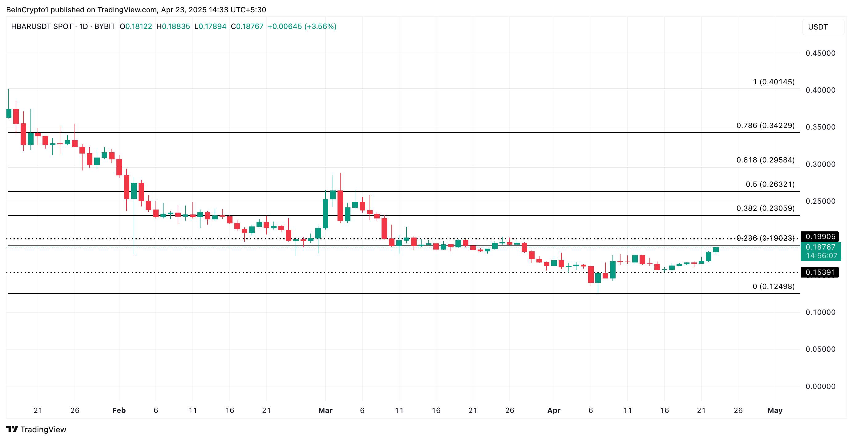 На момент написания этого анализа HBAR торгуется по $0,187, преодолев сопротивление на уровне $0,190. Если спрос усилится и быки закрепят этот уровень как новую поддержку, токен получит шанс продолжить рост до $0,199.