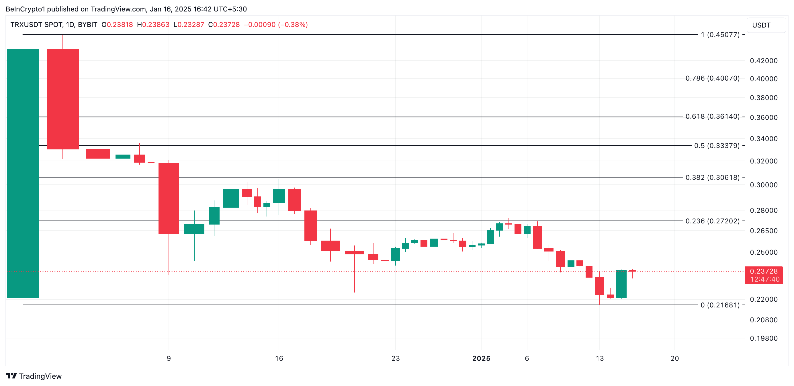 Если восходящий тренд TRX продолжится, его цена может вырасти до $0,27. С другой стороны, снижение давления покупателей чревато просадкой до $0,21.