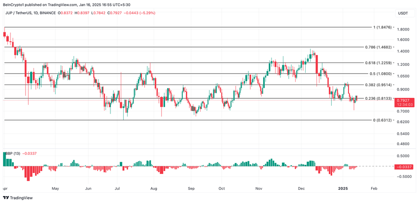 JUP — еще один трендовый альткоин сегодня: его цена выросла на 1% за последние 24 часа. Однако дневной график показывает, что рост цены обусловлен ралли на более широком рынке, а не спросом на сам альткоин. Об этом говорит отрицательный индекс Elder-Ray, который на момент написания составляет -0,03.
