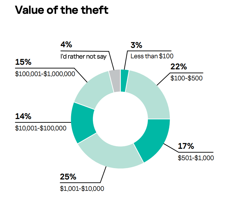 Средняя стоимость похищенного имущества составила $97 583. Однако медианный показатель был бы гораздо ниже – суммы свыше $10 000 были украдены только в 29%, а свыше $100 000 – в 15% случаев.
