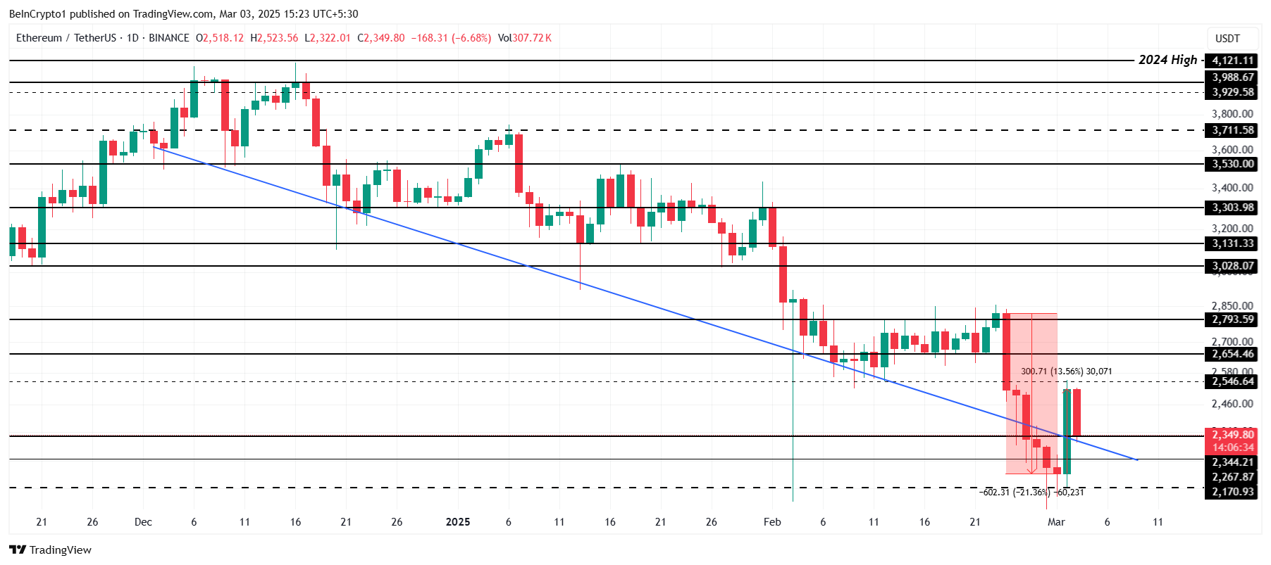 Ethereum вырос на 13% в понедельник, но затем немного снизился и сейчас торгуется на уровне $2 349. Несмотря на это, ETH успешно преодолел линию поддержки нисходящего тренда, что укрепляет его бычью позицию. Удержание выше этого уровня важно для продолжения роста.