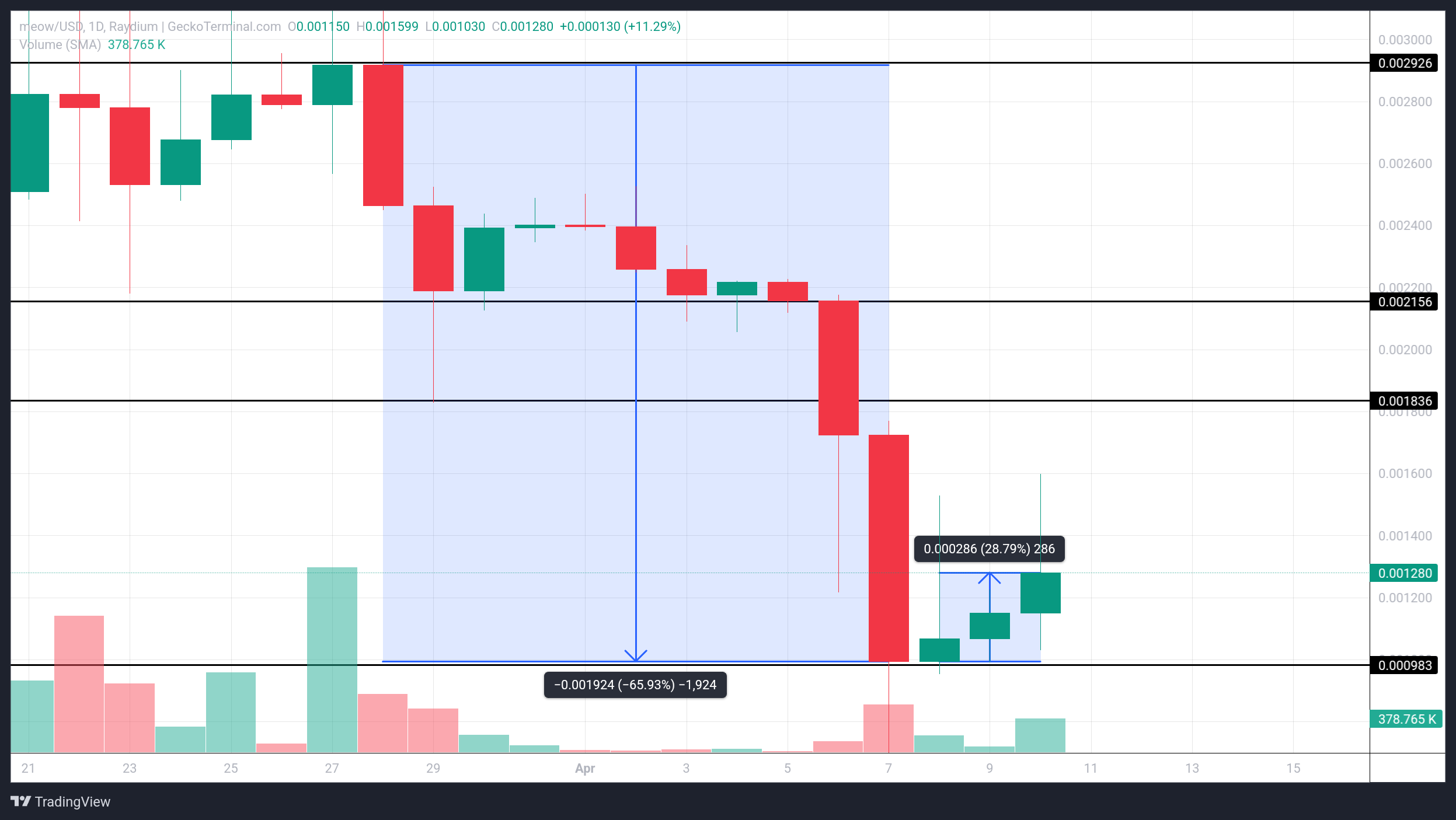 MEOW не смог воспользоваться общим ростом на рынке. За последние 48 часов он прибавил всего 28%, достигнув отметки $0,00128. В то время как другие альткоины демонстрируют ралли, MEOW остается в тени.