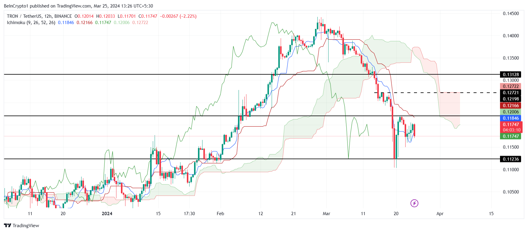 На момент написания статьи Tron торгуется на уровне $0,1174 после того, как цена не смогла преодолеть барьер на отметке $0,1219. Кажется, что на данный момент падение было остановлено, но потенциально оно может продолжиться. Это связано с тем, что криптоактив, который торговался ниже облака Ишимоку, теперь демонстрирует подтвержденный нисходящий тренд, поскольку само облако за последние 48 часов стало красным.