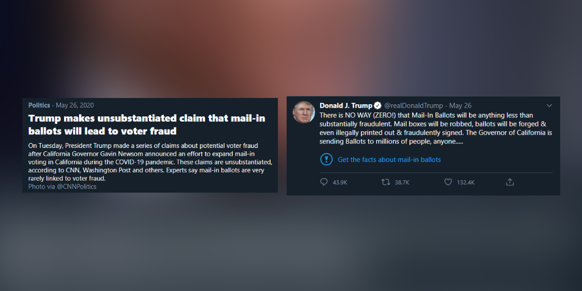 26 мая, в своих постах в Twitter, Трамп призвал не верить в чистоплотность голосования на ноябрьских выборах президента США по почте. Таким образом, по утверждению Трампа, голосование может вылиться в “подтасовку” голосов.