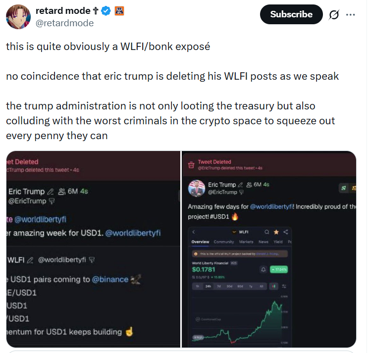 В то же время в соцсетях появились неподтвержденные сообщения о том, что сын президента США, Эрик Трамп, удалил старые рекламные публикации об USD1 на фоне волатильности токена.