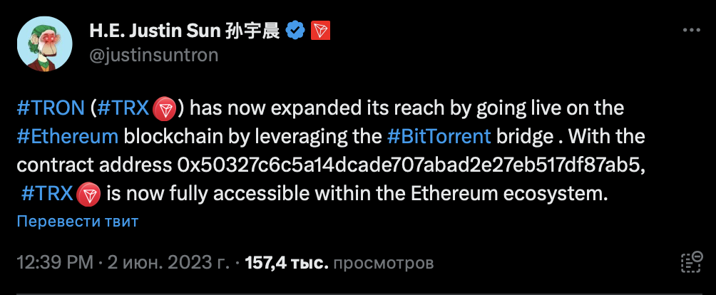 Команда Tron внедряет в экосистему новые разработки, чтобы расширить ее функционал и ускорить темпы массового принятия. 2 июня основатель проекта Джастин Сан написал в «Твиттере», что нативный токен сети TRX стал доступен на блокчейне Ethereum благодаря мосту BitTorrent, и указал адрес контракта.