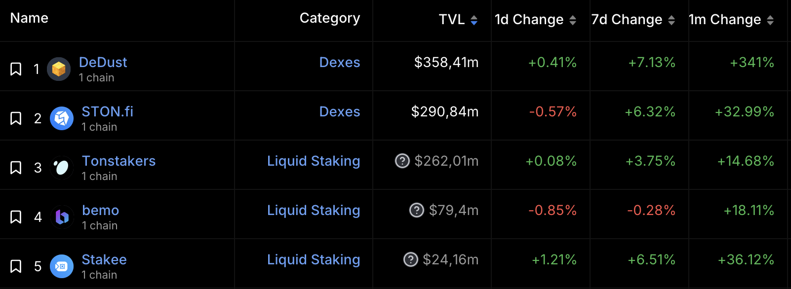 Крупнейший по значению TVL проект на базе The Open Network — децентрализованная биржа (DEX) DeDust. Сейчас в ней заблокировано более $358 млн пользовательских средств. Всего за месяц показатель площадки взлетел на 341%.