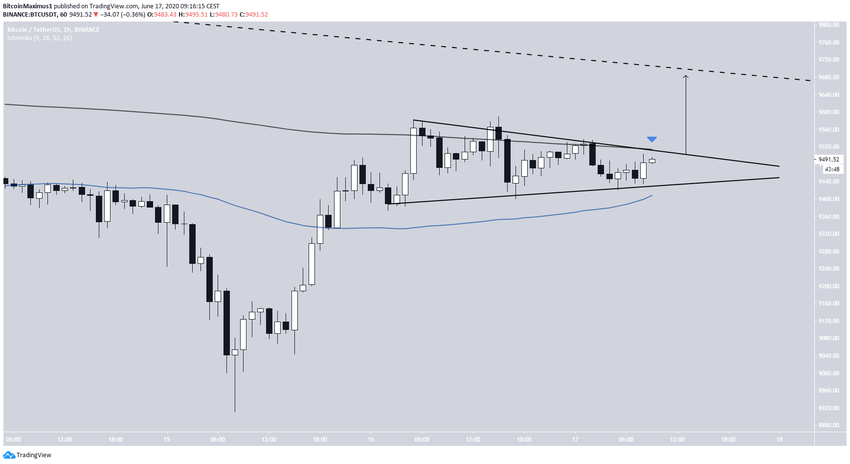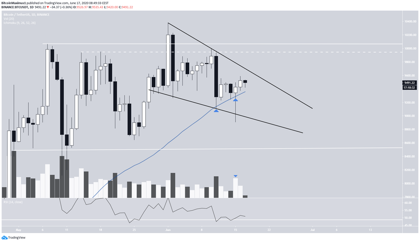 15 июня курс биткоина отметил минимум на $8910 и с тех пор устойчиво укрепляется. Сейчас торги проходят внутри симметричного треугольника, из которого пара может совершить бычий прорыв.