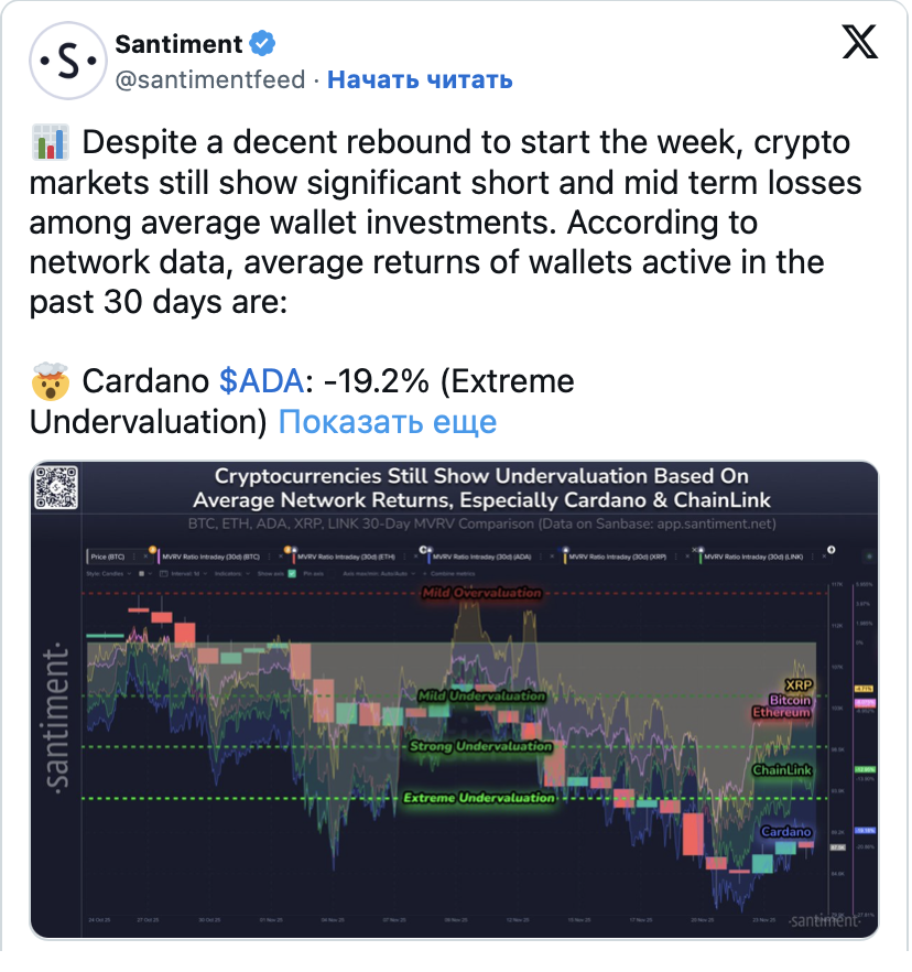 SponsoredАналитики Santiment не акцентируют внимание на потерях. Напротив, они указывают на недооцененность активов. Это подразумевает потенциал возврата котировок к средним значениям оценки.
